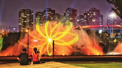 8月18日晚,一家三口惬意赏“秀”。夜幕降临,长风商务区璀璨夺目,水幕光影秀以其独特的魅力,吸引了市民和游客。王 昕 郭苑甫 摄影报道