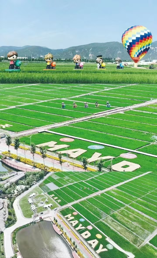 作为五月天的忠实粉丝,我们的第一站是稻田公园。这里有五月天主题公仔、能俯瞰全景的热气球、沿着田埂绕行的小火车,还有太原稻田民俗文化博物馆、晋祠米铺等,是五月天歌迷们的打卡胜地。侯老师、朋友和我排着队沿着田埂行走,拍了很多张充满文艺气息的照片。侯老师说等稻子成熟后,公园的工作人员会用稻草扎成各种各样的公仔和小房子。想象一下秋高气爽的时候,空气中弥漫着稻米的香气,眼前一片金黄,是多么惬意的场景。