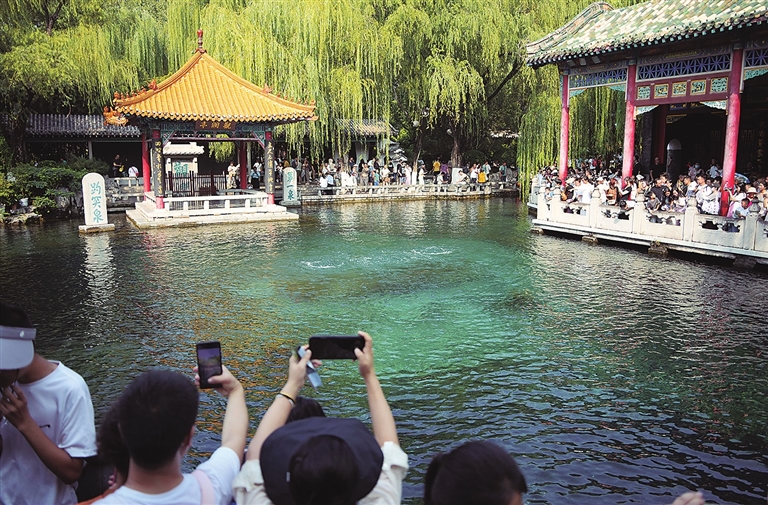 近日,受降雨影响,位于山东省济南市的趵突泉地下水位上升到28.70米以上,泉水喷涌有力,“趵突腾空”美景重现。
