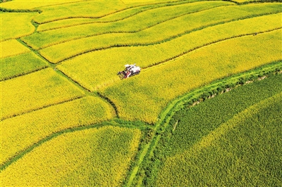 8月24日,在湖南省娄底市双峰县井字镇铜梁村,农民驾驶农机收割中稻(无人机照片)。