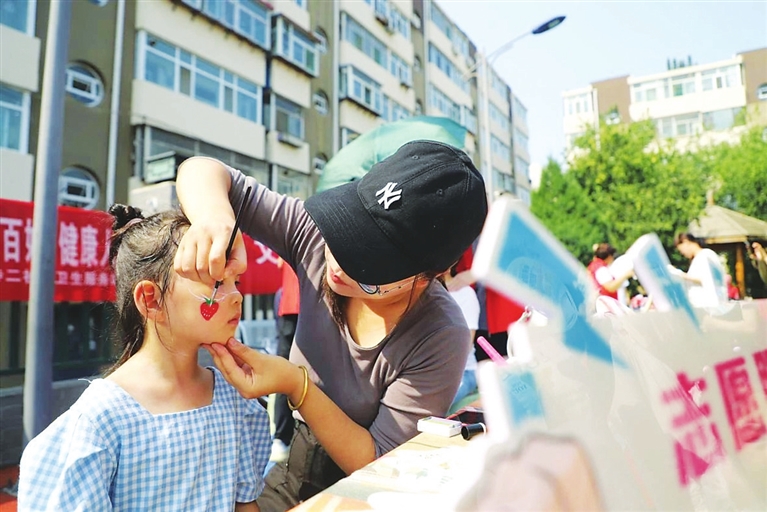 最吸引小朋友目光的当属“面部彩绘”摊位。专业彩绘师根据小朋友们的喜好,耐心调色、润色,手中的画笔轻轻点上几笔,五颜六色的“小蝴蝶”“小兔子”“蝙蝠侠”便出现在小朋友的脸上。