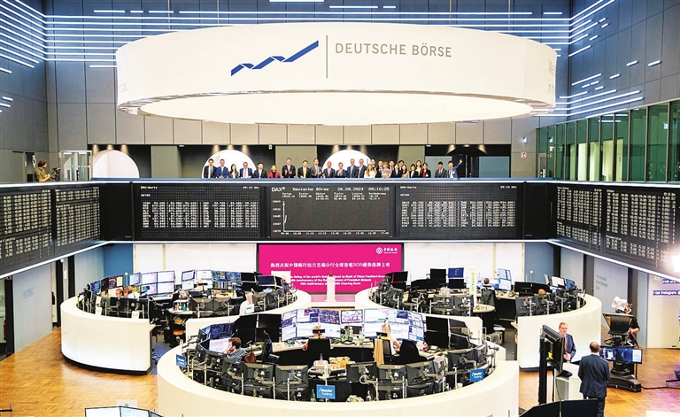 8月26日,嘉宾在德国法兰克福证券交易所合影。全球首只人民币SGS债券26日在德国法兰克福证券交易所上市。SGS是可持续发展挂钩贷款、绿色贷款和社会责任贷款三类贷款合集的简称。中国银行官网日前宣布,中行法兰克福分行SGS债券8月13日成功发行,规模为25亿元人民币,品种为2年期固息。
