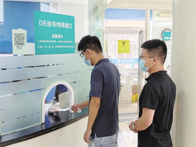 走进北大医院太原医院(太原市中心医院)门诊大厅,“0元挂号开单处”字样贴在挂号窗口上,格外显眼。不少患者在窗口询问。