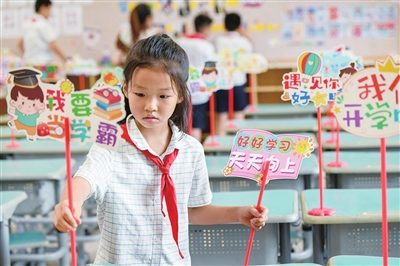 8月27日,浙江省金华市婺城小学学生在布置教室课桌。秋季新学期开学在即,各地做好开学前的准备工作,迎接新学期的到来。新华社发(时宽兵 摄)