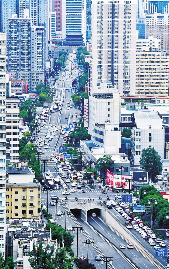 9月1日,五一路两侧鳞次栉比的建筑与川流不息的车辆,构成了一幅城市繁荣画卷。邓寅明 摄
