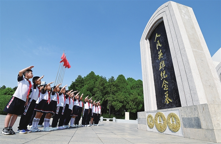 9月3日,河北省邯郸市邯山区赵王小学的学生在晋冀鲁豫烈士陵园人民英雄纪念墓前敬礼。 当日是中国人民抗日战争暨世界反法西斯战争胜利79周年纪念日,各地举行多种形式的纪念活动,铭记历史,缅怀先烈。新华社发(郝群英 摄)