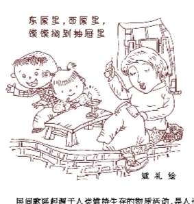 母亲唱过的歌谣倒是记住了不少。记忆里的夜晚,煤油灯幽幽地亮着光,母亲不是在“嗤儿嗤儿”地纳鞋底,就是在狭窄逼仄的炕上“嗡嗡”地摇着纺车纺织棉花。“东厦里,西厦里,馍馍搁到抽屉里,乃馍啷?猫吃啦。乃猫啷?上天啦。乃天啷?下雨啦。乃雨啷?和泥啦。乃泥啷?筑墙啦。乃墙啷?猪揎啦。乃猪啷?剥皮啦。乃皮啷?蒙鼓啦。乃鼓啷?娃敲啦。乃娃啷?娃跑啦!”歌谣一首接着一首,悠悠扬扬,高低起伏,在昏暗的煤油灯光里荡漾着。