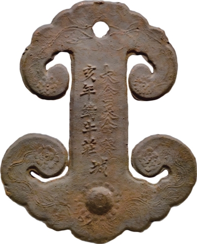 此次展陈中,一件名为“铁铸云板”的文物是沈阳故宫博物院的镇馆之宝。该板身整体呈长方形,上下部略宽、呈云朵形。云板本为木制,最初是寺院里报时的器具。明代以后开始用于军事报警。这件云板的特别之处在于铸有“大金天命癸亥年铸牛庄城”字样。清朝曾经称“金”,史称“后金”。1636年,皇太极将国号改称为大清后,为消除民众对金朝的恶劣印象,几乎把与“金朝”字样有关的东西都毁掉了,但这块云板得以幸存,因此非常珍贵。