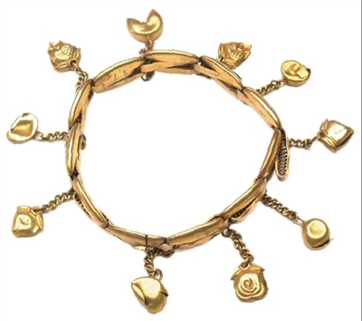 展品中的垂果包金手镯亦颇为珍贵。手镯共由11节银鎏金金属条相连构成,每节均有三个金属条横向组成,中间内含弹簧,可调节松紧,以方便佩戴。这只手镯,曾是清朝末代皇后婉容所佩戴的饰品。