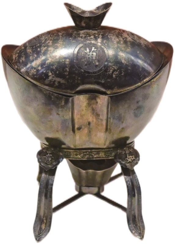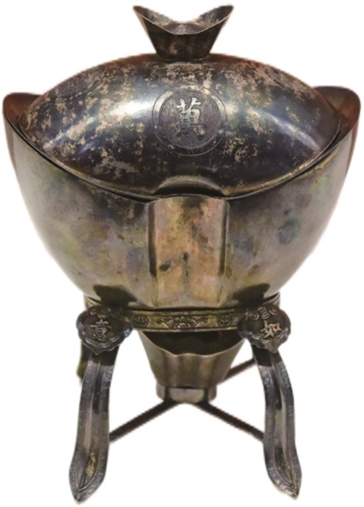 展览中有一件宫廷小火锅也十分有趣,它名为“万年甲子元宝式火碗”,造型像椭圆形元宝,分为碗上盖、衬碟、火碗、碗架、盛火碗五个部分,进食时点燃当时的“酒精”以保温食物,很像现在仅供一人使用的小火锅。