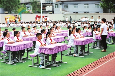 9月6日,公园路万科紫郡小学举行新学期养成教育课程展示活动,培养学生良好的行为习惯。张昊宇 摄
