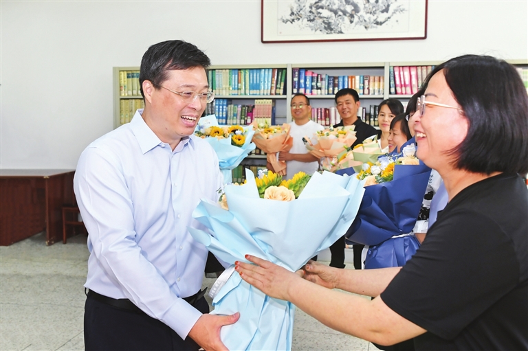 西华苑小学环境优美宜人,教室里书声琅琅。张新伟走进校园,认真听取学校招生、师资和教学等情况介绍,在体能活动中心、学生健康管理中心、食堂、图书馆等区域,实地察看基础设施建设和运行管理情况,与学校负责人和教职工亲切交谈,向辛勤工作在教学一线的教师送上节日问候。他强调,广大教师要牢记为党育人、为国育才的初心使命,持续增强传道授业解惑本领,不断培养德智体美劳全面发展的社会主义建设者和接班人。他叮嘱学校突出办学特色,打造高质量师资队伍,用心用情用力办好有温度的教育,为推动基础教育优质均衡发展贡献力量。