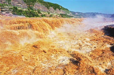 近日,受上游水库联合排沙影响,黄河干流水量大涨,滚滚黄河水裹挟着泥沙奔腾而下,位于山西吉县和陕西宜川县交界的壶口瀑布出现“金瀑飞流”景观,吸引众多游客。