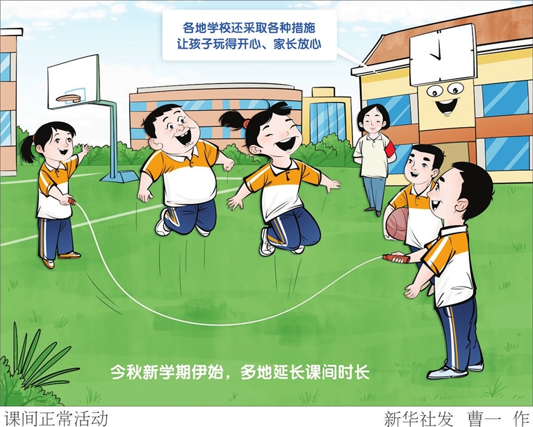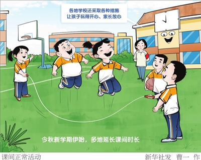 今秋新学期伊始,“新华视点”记者采访发现,不少地方已将“课间10分钟”延长至15分钟,甚至20分钟,孩子们有了更充裕的时间走出教室。同时,各地学校还采取各种措施,让孩子玩得开心、家长放心。