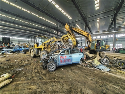 拆除了发动机、变速箱、轮胎、电池、玻璃、内饰等物品,旧车就只剩下了车架部分。“剩下的车架,会把它们压缩打包,再销售给冶金企业,重新生产出汽车用钢,实现资源的循环利用。”