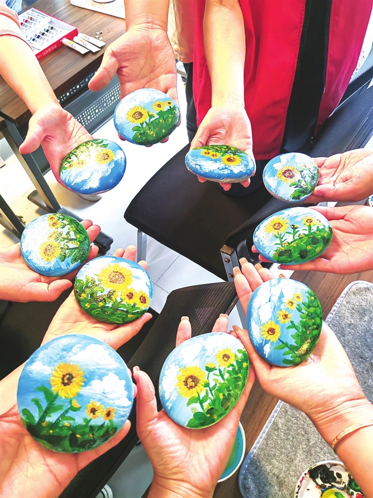 实操环节,居民们纷纷挑选自己喜欢的石头,任意发挥想象,在老师的指导下用细腻笔触绘出心中的完美图案。不一会儿,一幅幅精美的创意石头画便呈现在大家面前,原本平淡无奇的石头,在居民们的一双双巧手中变成了一件件妙趣横生的艺术品。