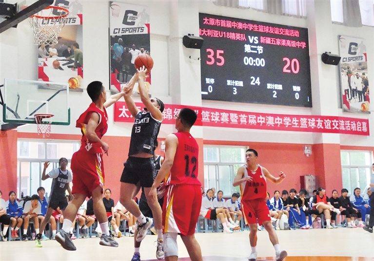 九月二十四日,进山中学篮球馆内,澳大利亚青年队与新疆五家渠高级中学队激战正酣。作为太原市“锦绣杯”篮球系列赛之一,首届中澳中学生篮球友谊交流活动以“篮球传友谊,中澳共成长”为主题,旨在促进中澳中学生之间的文化交流与友谊。我市多所中学组队参赛。王韵菲 摄