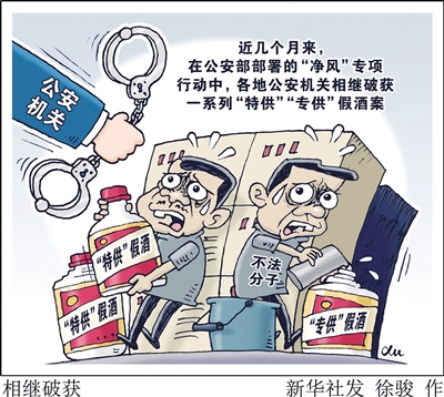 近几个月来,在公安部部署的“净风”专项行动中,各地公安机关相继破获一系列“特供”“专供”假酒案。