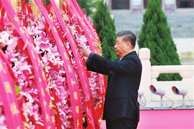 习近平迈步上前,仔细整理花篮缎带。随后,习近平等党和国家领导人缓步绕行,瞻仰人民英雄纪念碑。