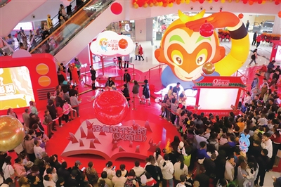 国庆假期,“悟空”热度持续火爆。图为10月2日,在解放路万达广场内,两个巨大的1961年版《大闹天宫》美猴王造型吸引众多市民打卡留念。张昊宇 摄