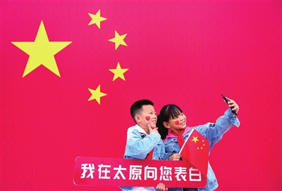 10月5日,小朋友在太原火车站站前广场与国旗合影。耿婧媛 摄