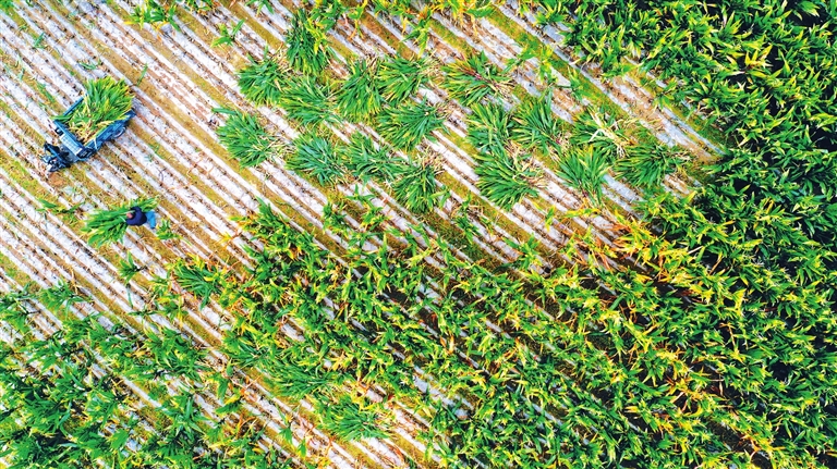 10月7日,阳曲县泥屯镇南路村农民在田间秋收。目前,我市各县区全力以赴抓好秋粮收获,确保粮食颗粒归仓。