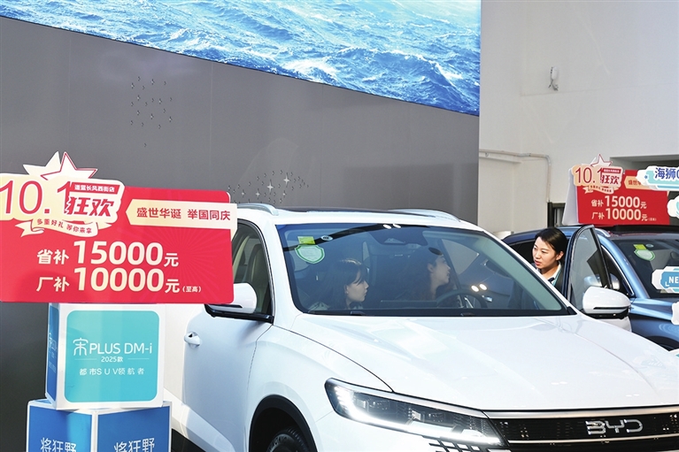 10月7日,万柏林区一家新能源汽贸城内,消费者在选购汽车。据介绍,国庆假期,该店实现订单150辆,较平时增长30%。随着我市汽车以旧换新最新补贴政策出台,国庆假期,汽车销售迎来旺季。郭苑甫 张昊宇 摄影报道