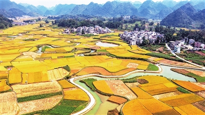 10月7日在广西靖西禄峒镇大院村拍摄的田园景色(无人机照片)。金秋时节,乡间农田与河流、群山、村落相互映衬,一步一景,美不胜收。新华社发(赵京武 摄)