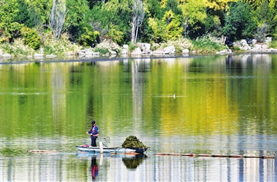 进入秋季,缤纷落叶飘到汾河河面需要尽快清理,否则会腐烂影响水质。汾河景区加派人手,及时清理河面落叶。10月10日,工作人员正在清理河面落叶。