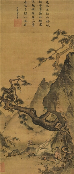 《松寿图》轴,绢本,设色,纵122厘米、横52.7厘米。该图绘松石远岫,奇峰突起,一老者坐于石台之上,仰首远眺,似有所思,旁侧一童子抱杖侍立。峰顶苍松斜伸,山下悬壁劲松横空,与远近重叠的峰峦相互辉映,形象地表达了“如松柏之寿”和“如嵩山之禄”的寓意。临溪疏竹自然生动,增添了几分轻松与潇洒的情趣。整件作品画风豪放严谨,虽简实繁,取景奇特,笔墨淋漓,山石用大斧劈皴,画笔峭拔方硬。
