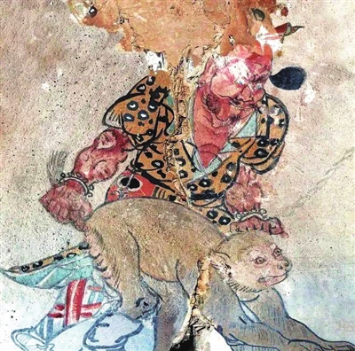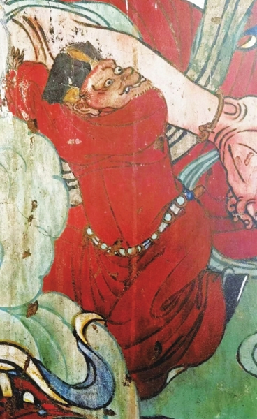 明代繁峙公主寺壁画里的猴子(图三)。这只猴子身穿明代官服,面目狰狞,龇牙咧嘴,正在反抗明王对他的镇压。