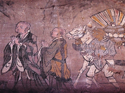 元代稷山青龙寺的拱眼壁画《唐僧取经图》(图二)。由图可见,此猴已经非常接近《西游记》里的猴子形象,且头戴“紧箍”。只不过缺少他的武器金箍棒和八戒、沙僧两个师弟,所以只能由“大师兄”亲自牵马了。