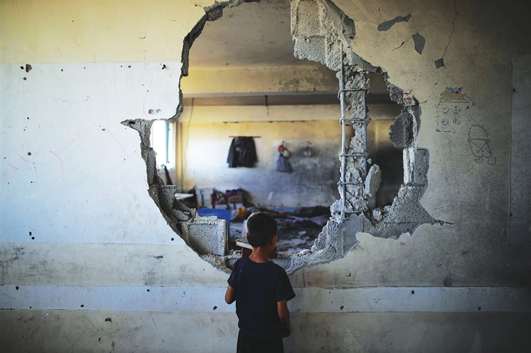 10月14日,在加沙地带中部努赛赖特难民营,一名儿童看着遭以军袭击的学校。据巴勒斯坦通讯社13日报道,以色列军队当天轰炸加沙地带中部努赛赖特难民营的一所学校,造成至少19人死亡。新华社发