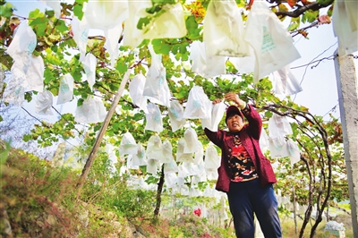 10月16日,姚村镇黄楼村的龙眼葡萄挂满枝头,村民喜获丰收。近年来,当地积极发展种植园与采摘体验项目,带动农民增收致富。王韵菲 摄
