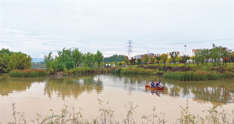 十月十八日,柴村铁路桥下,汾河景区的工作人员在打捞河面污物,为游客提供良好的游园环境。李学军 摄