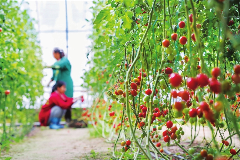 10月22日,杏花岭区山河村蔬菜采摘大棚里,工作人员在采摘新品种西红柿。今年,该村新引进的粉玲珑西红柿喜获丰收。王韵菲 摄
