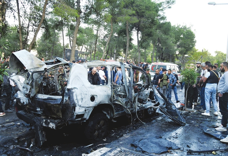 10月21日,在叙利亚首都大马士革西部迈宰地区,人们聚集在遭袭汽车旁。叙利亚军方21日发表声明说,叙首都大马士革一辆汽车当天遭以色列空袭,造成2人死亡、3人受伤。