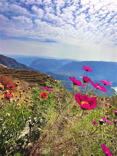 路边,格桑花在风中摇摆,蓝天白云呼啸而来,海洋般将人整个包裹。路,浮起在群山之上,高高地与天相接。