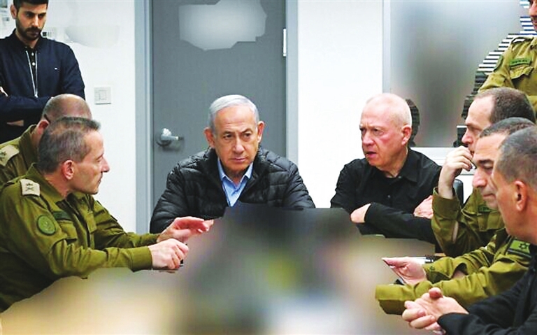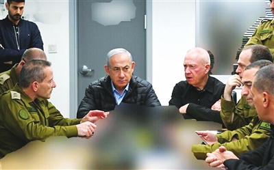 这张10月26日发布的照片显示,在对伊朗袭击期间,以色列总理内塔尼亚胡(中左)、国防部长加兰特(中右)以及国防军高级指挥人员坐在位于特拉维夫的国防军总部内。新华社发