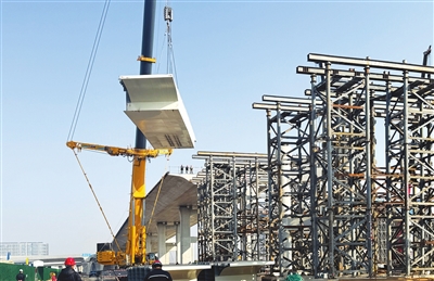 11月1日,太原武宿机场空港配套工程项目机场东路,施工人员正在吊装高架桥钢箱梁。该路建成后,市民进出机场将更加便捷。牛利敏 路军华 摄影报道