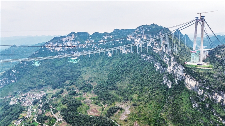 11月4日,在建世界最高桥——贵州花江峡谷大桥建设取得重要进展:随着缆索吊机将重约215吨的首件钢桁梁精准吊装至指定位置,大桥施工进入新阶段。2022年开工建设的花江峡谷大桥,因跨越被誉为“地球裂缝”的花江大峡谷而得名。全长2890米的大桥为钢桁梁悬索桥,桥面距水面垂直高度625米,建成后将成为新的世界第一高桥。新华社记者 陶 亮 摄