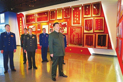 随后,习近平参观了空降兵军军史馆。该军是一支历史厚重、功勋卓著的英雄部队,革命战争年代历经战火硝烟洗礼,抗美援朝战争上甘岭战役中打出了国威军威,和平建设时期出色完成一系列重大任务,涌现出一大批英雄集体和英模人物。习近平仔细观看展陈,认真听取讲解。他叮嘱大家,要用好红色资源优势,教育引导官兵把光荣传统弘扬好,争做新时代英雄传人。