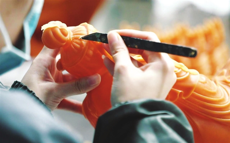 “失蜡法简单地说就是用蜡来造型,用泥做范,然后高温将蜡流失掉,这个泥范就形成了一个空的型腔,然后再把熔炼好的铜水浇进型腔中,最后把泥范打碎就获得了一个铜的器物。”李跃斌说,李氏失蜡法铸造工艺传承到他这一代已经是第四代了,工艺流程已经非常成熟,但依旧对细节要求极高且需要制作者十分擅长极精细的精密铸造。“失蜡法铸造工艺承载了我们的民族文化,作为传承人,将此技艺发扬光大并推陈出新是我的责任。”