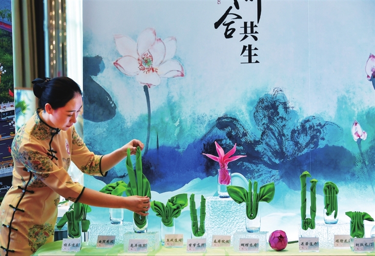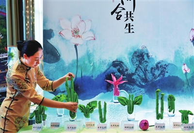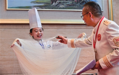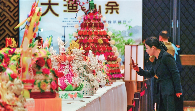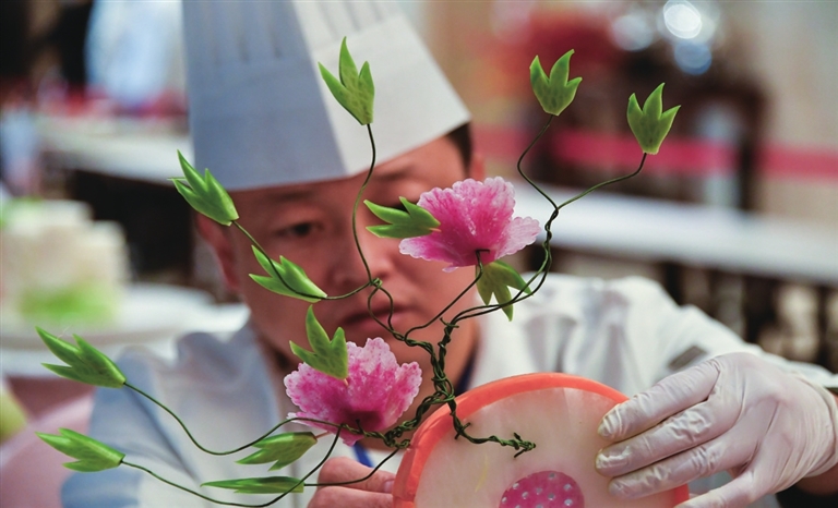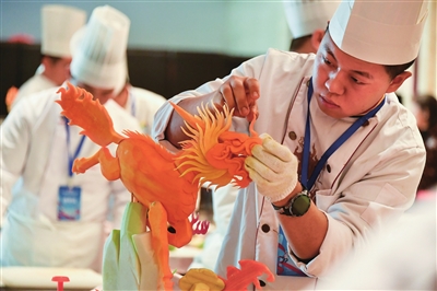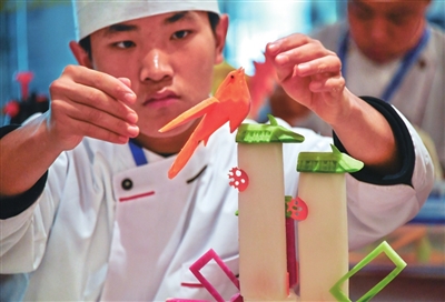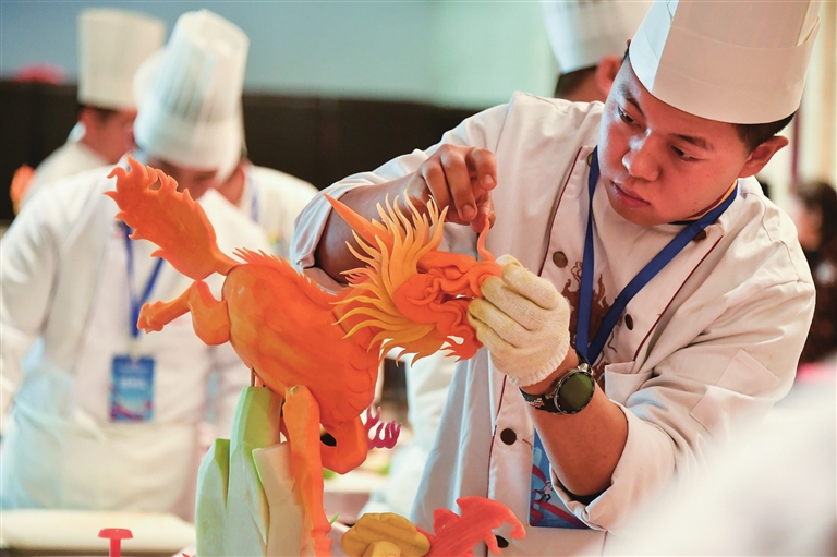 惟妙惟肖的十二生肖面雕、以“黑神话:悟空”为主题的创新菜系、将特色美食与山西传统建筑相结合的创意摆盘……在这场技艺与创意的巅峰对决中,惊喜连连。中式面点赛区的选手刀法娴熟,将面团切成薄如蝉翼的面条;烹饪艺术赛区,参赛选手凭借精湛技艺,将手中的瓜菜雕刻成一件件栩栩如生的艺术品;中餐服务赛区,“盛世繁华 雅韵中华”“竹韵”“鸟语花香”,一桌一主题,通过精致细腻的布置与餐具搭配,展现中华传统文化的博大精深与现代审美的有机融合;茶艺服务赛区,参赛选手通过古装表演,将茶艺与中华传统服饰文化巧妙结合,为与会人员带来了一场美食与艺术共融、味觉和视觉共享的文化盛宴。