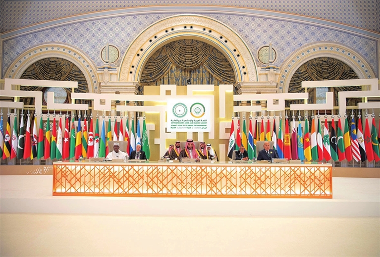 11月11日,沙特阿拉伯王储穆罕默德·本·萨勒曼在利雅得举行的阿拉伯-伊斯兰国家特别峰会上讲话。阿拉伯-伊斯兰国家特别峰会11日在沙特阿拉伯首都利雅得举行。会议重申对巴勒斯坦和黎巴嫩的支持,呼吁联合国安理会出台具有约束力的决议,促使以色列停火。新华社发