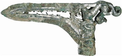 虎鹰互搏銎内戈诞生于2500年前的春秋晚期,于1988年发现于山西太原金胜村赵卿大墓。随葬品中的这件虎鹰互搏銎内戈,经过2000多年的岁月洗礼,至今仍可见其锋利的刃部。它的长度为20.3厘米,援长13厘米,前锋尖锐,援作三角形,横断面中间厚、两侧薄,中间透镂着精美花纹,虽然已经锈蚀,但依然可以欣赏到考究的工艺。