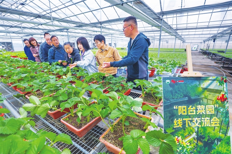 11月18日,在浙江省杭州市钱塘区的“勿忘农集团科研中心”,杭城市民代表、杭州市农业农村局的农技专家参观“阳台菜园”品种展,交流“阳台菜园”种植心得。