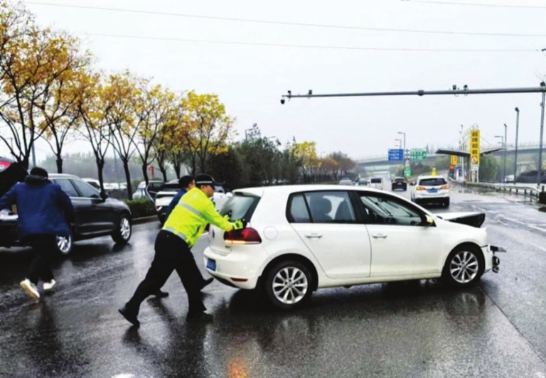 11月13日,阴雨。一大早,为确保早高峰时段道路顺畅,交警小店一大队五中队第一时间开展巡逻管控。太榆路蓝海汽配城路段发现一起因道路湿滑导致的追尾事故,因车辆损坏严重已无法驶离,为减少后方拥堵,预防次生事故发生,民警立即和现场群众一起将车推至了安全区域,把安全隐患降到最小。驾驶员对执勤民警的及时帮助表示感谢。