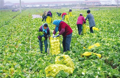 11月24日,河北省遵化市团瓢庄镇农民在田间收获大白菜。