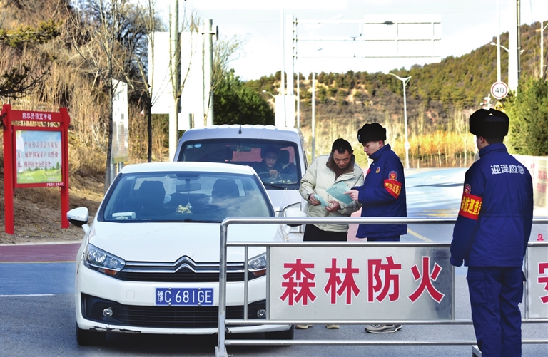 11月28日,迎泽区观家峪村森防检查站,区应急管理局的工作人员正在向进山人员宣传森林防火知识,筑牢冬季森林防火安全墙。牛利敏 摄